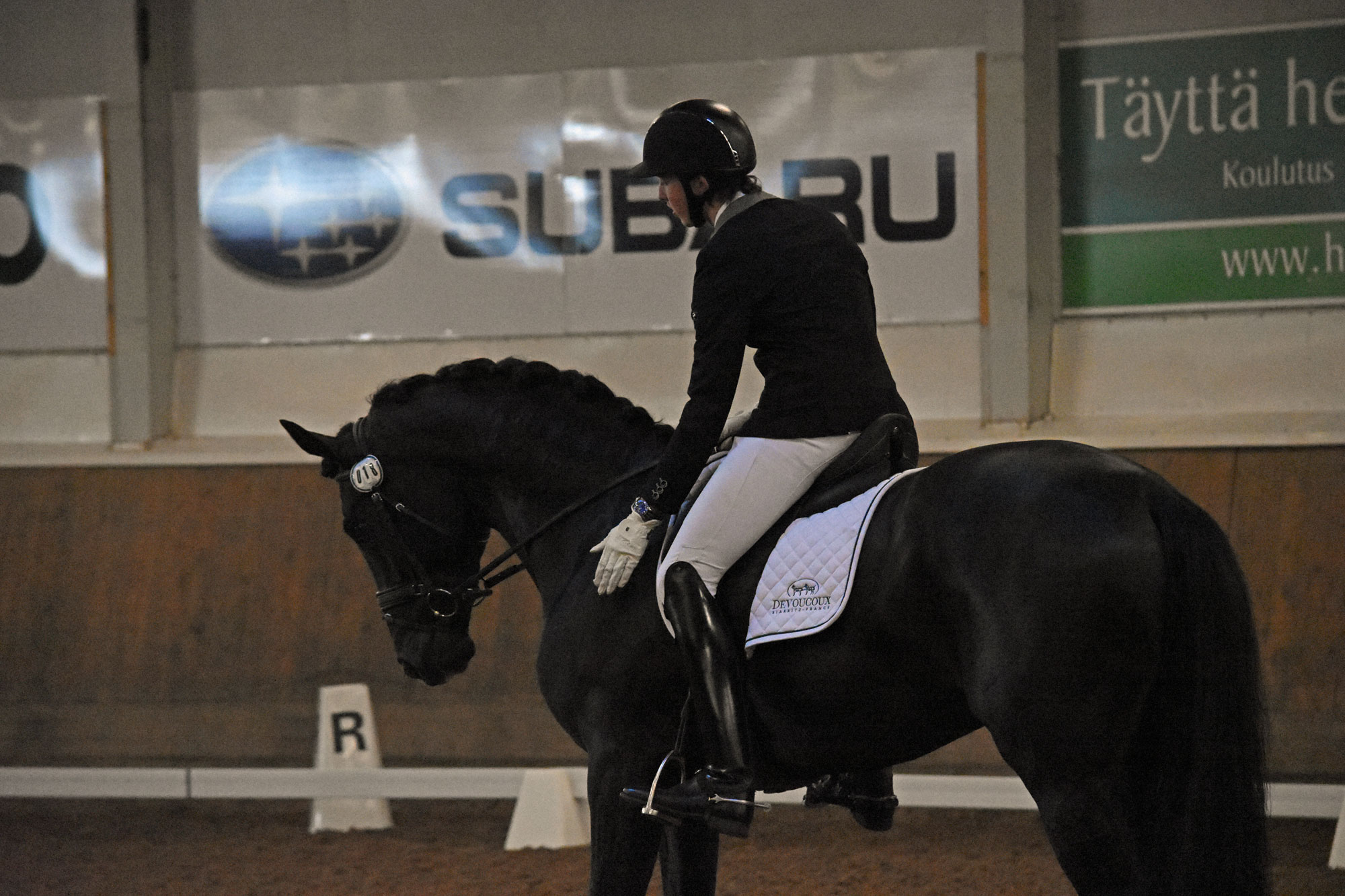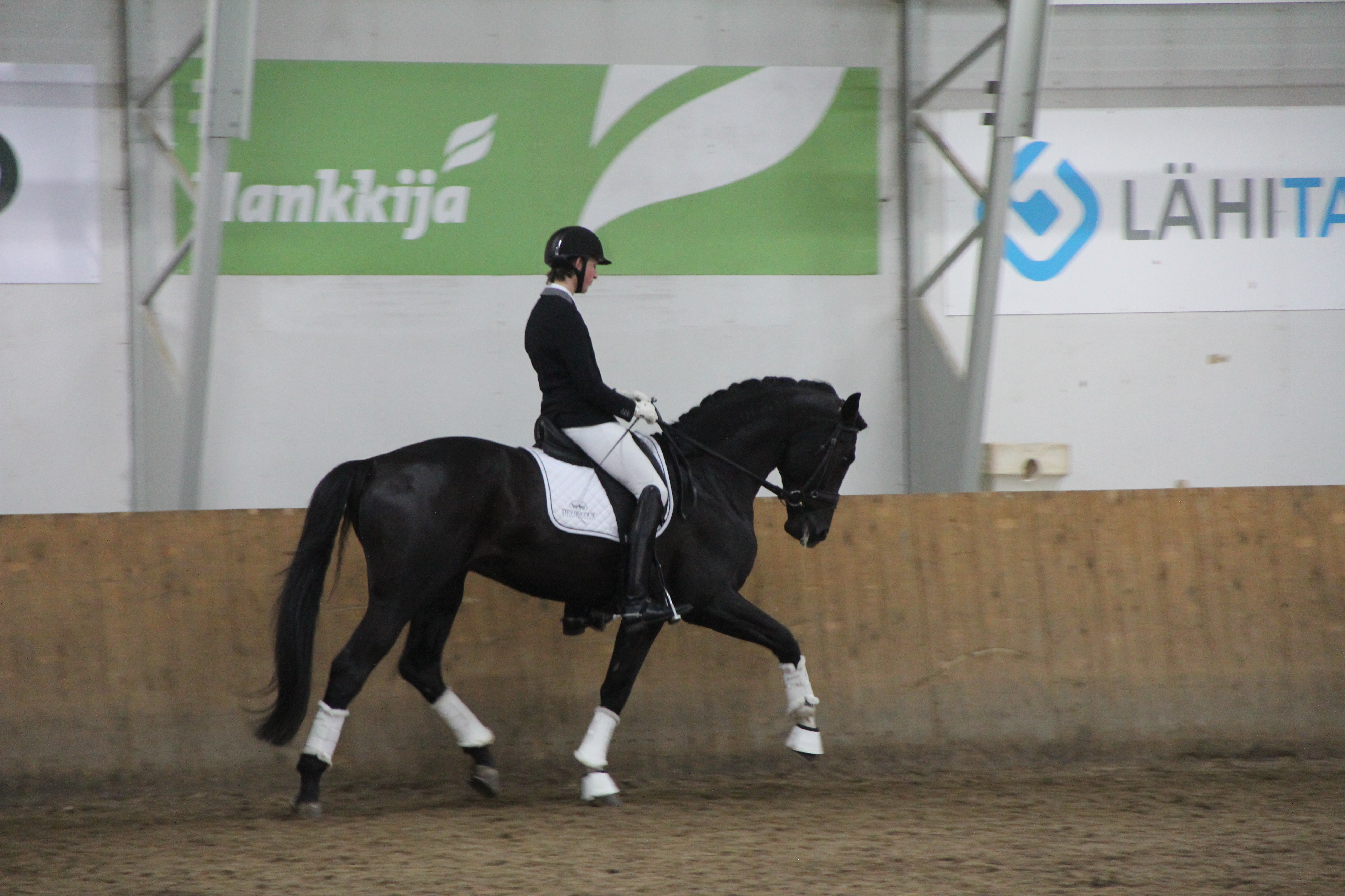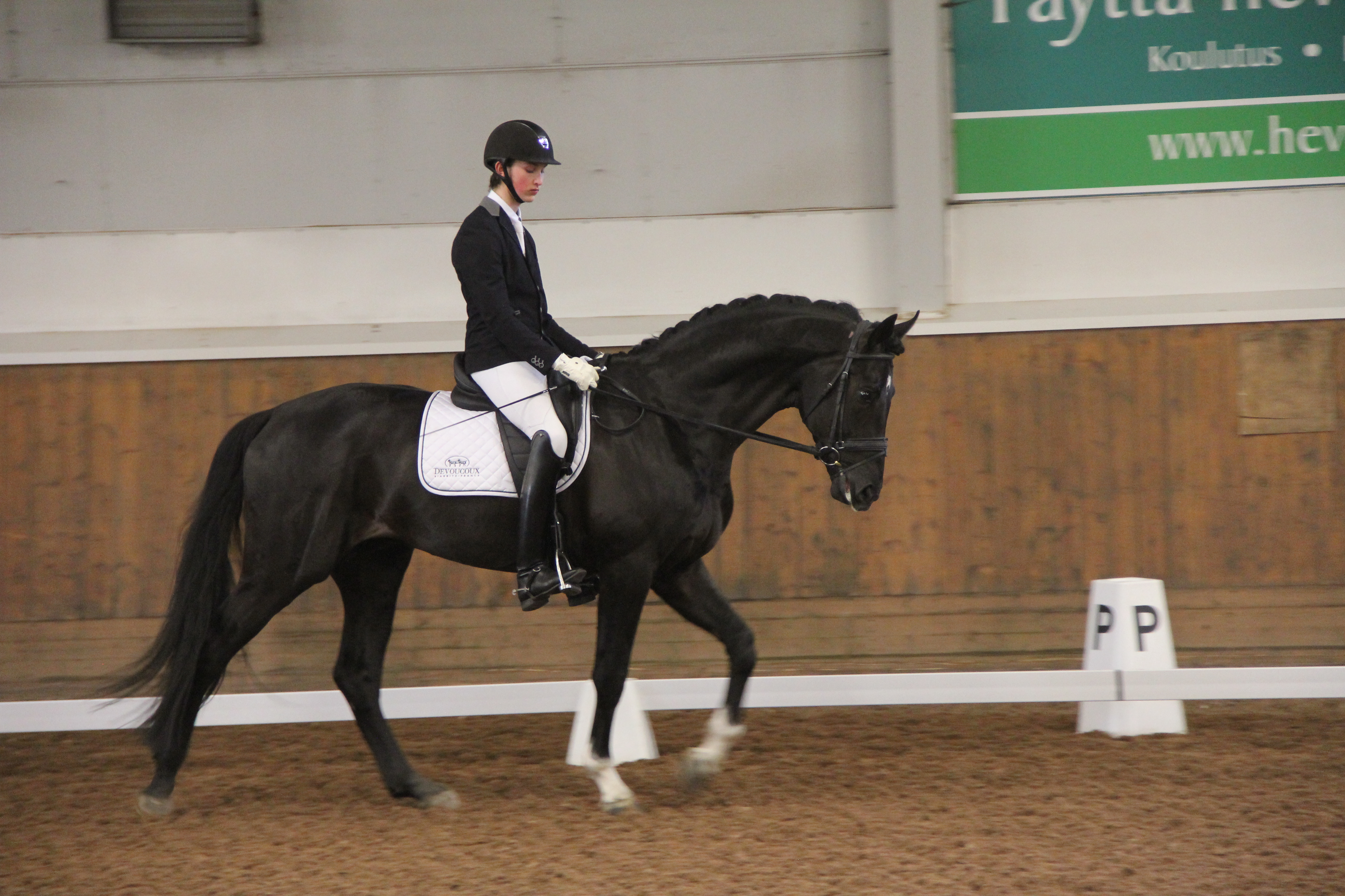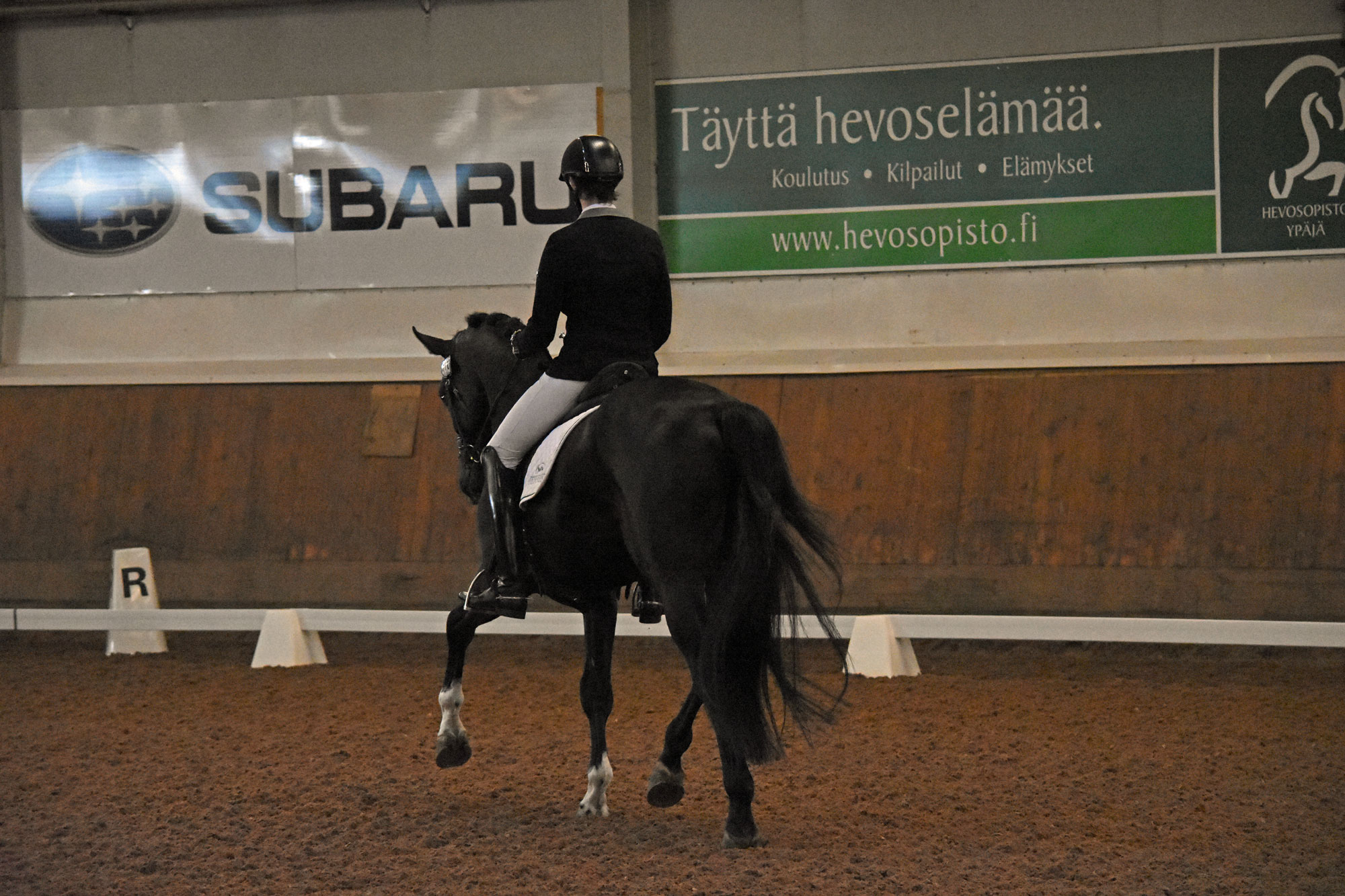 Hevonen on hyvin pohkeen edessä ja on nopea reagoimaan. Tasainen molempiin suuntiin. Oikea laukka hieman parempi.